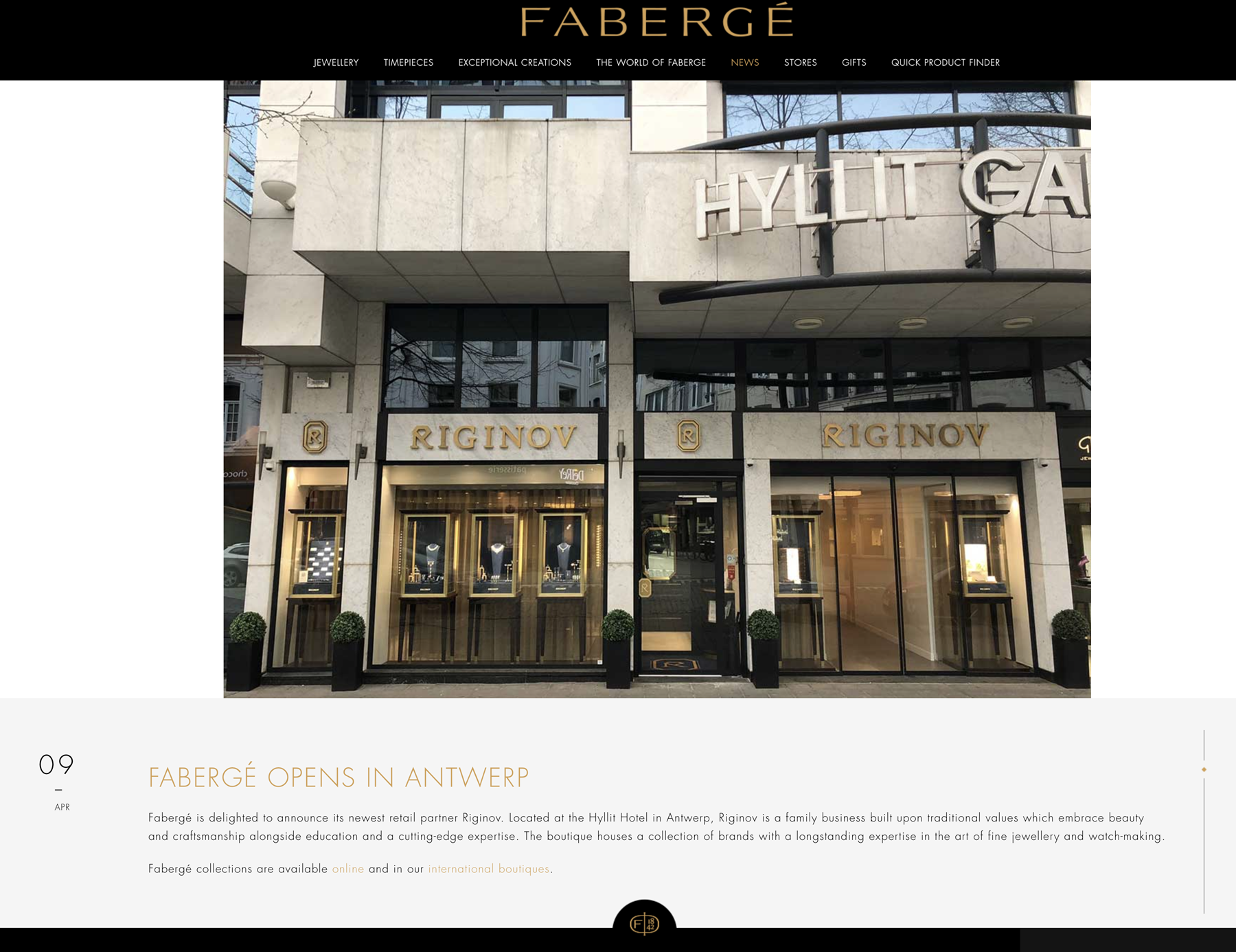 Fabergé is delighted to announce its newest retail partner Riginov. Located at the Hyllit Hotel in Antwerp, Riginov is a family business built upon traditional values which embrace beauty and craftsmanship alongside education and a cutting-edge expertise. The boutique houses a collection of brands with a longstanding expertise in the art of fine jewelry and watch-making.